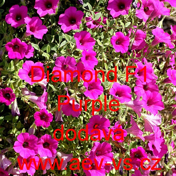 Popis: Petúnie zkřížená „surfínie“ převislá (Petunia hybrida pendula) Diamond F1 Purple je asi 25 centimetrů vysoká hluboce převislá purpurově fialová jednoletá květina. Vytváří až 80 centimetrové převisy. Bohatě vykvétá v průměru asi 8 centimetrovými pevnými, dešti i nepřízni počasí odolnými květy. Hodí se na záhon, do truhlíku, květináče a okrasného koryta. Semena se dodávají ve výběrové kvalitě Professional Seeds.