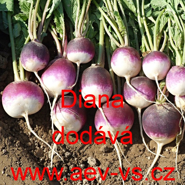 Popis: Ředkvička (Raphanus sativus var. sativus) Diana je velmi raná fialovobílá kulovitá ředkvička vhodná k rychlení i na záhon. Odolává praskání, houbovatění a vybíhání do květu. Vytváří křupavé bulvičky s aromatickou bílou dužninou.