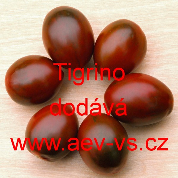 Popis: Rajče tyčkové (Solanum lycopersicum) Tigrino je velmi rané asi 150 centimetrů vysoké tyčkové rajče do skleníku, fóliovníku, na záhon i do truhlíku na balkon. Vytváří "pruhované" asi 16 až 20 gramové červeno/zeleno/hnědé kulovité v průměru asi 2 centimetrové aromatické plody s pevnou šťavnatou tmavě červenou až červenohnědou dužninou.
