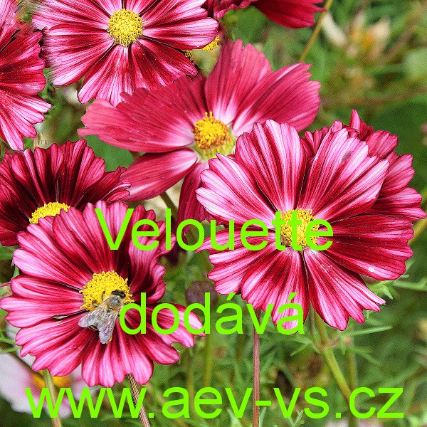 Popis: Krásenka zpeřená (Cosmos bipinnatus) Velouette je asi 60 až 70 centimetrů vysoká košatá bohatě kvetoucí tmavě červená jednoletá květina s bílými pruhy v okvětních plátcích. Některé květy mohou být i bílé s tmavě červeným zbarvením okolo středu květu a na okrajích okvětních plátků. Hodí se na záhon, do velkého květináče, truhlíku a okrasného koryta. Semena se dodávají ve výběrové kvalitě Professional Seeds.