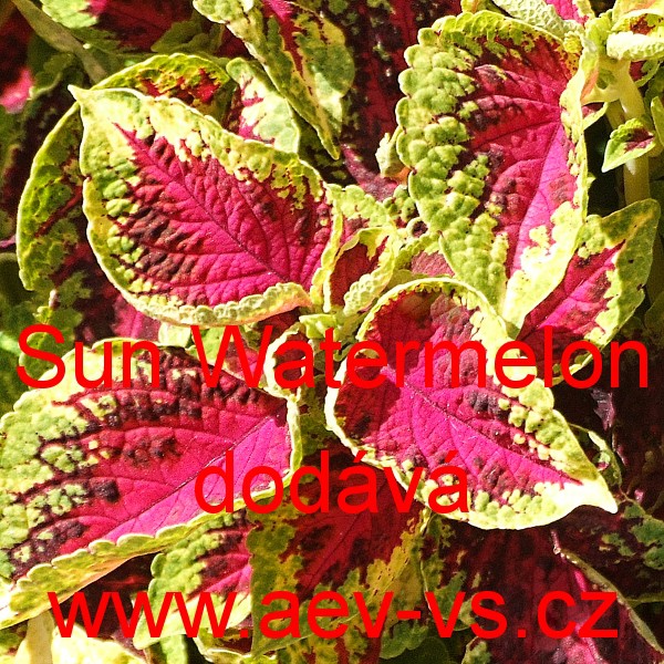 Africká kopřiva, Pochvatec ozdobný, šišákovitý, Kopřivěnka zkřížená (Coleus blumei) Sun Watermelon je vyšší jednoletá velice dekorativní květina. Vytváří okrasné svítivě zelené listy se sytě růžovým slabě žlutě orámovaným středem.
