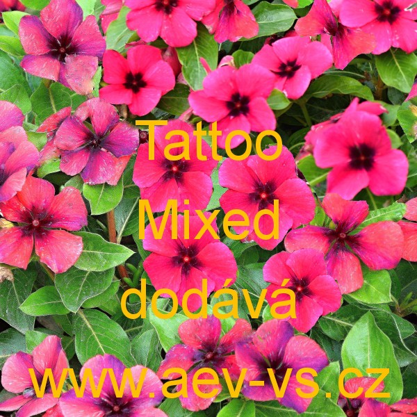 Popis: Barvínek růžový, katarantus, vinca (Catharanthus roseus) Tattoo Mixed je asi 25 až 35 centimetrů vysoká a asi 15 až 20 centimetrů široká pestrobarevná směs (červených odstínů a jejich kombinací) jednoletých košatých květin. Hodí se na záhon, do truhlíku, květináče, okrasného koryta a závěsných nádob. Výborně a neúnavně kvete i na přímém slunci. Semena se dodávají ve výběrové kvalitě Professional Seeds.