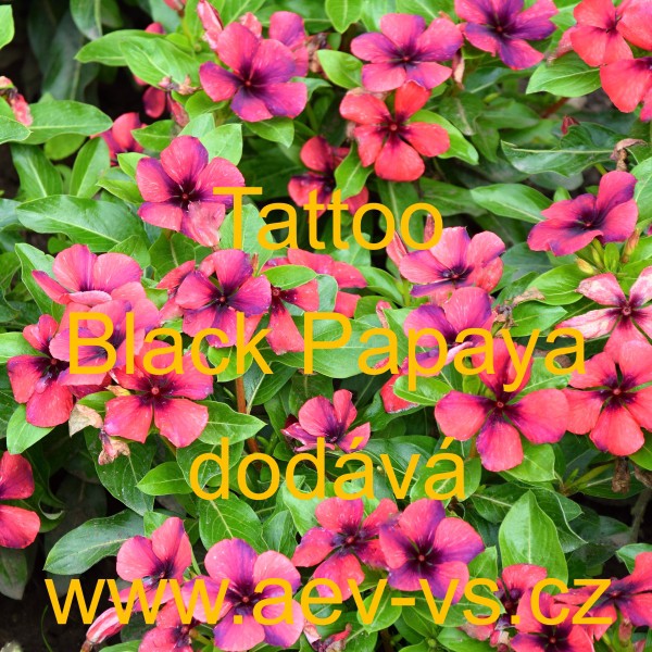 Popis: Barvínek růžový, katarantus, vinca (Catharanthus roseus) Tattoo Black Papaya je košatá asi 25 až 35 centimetrů vysoká a asi 15 až 20 centimetrů široká barevně velice neobvyklá a dekorativní růžovo/červeno/oranžová jednoletá květina s až černým středem květu. Hodí se na záhon, do truhlíku, květináče, okrasného koryta a závěsných nádob. Výborně kvete i na přímém slunci. Semena se dodávají ve výběrové kvalitě Professional Seeds.