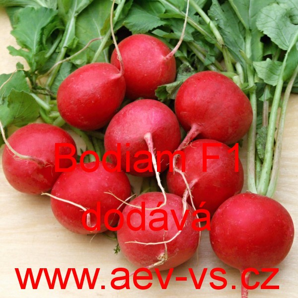 Ředkvička (Raphanus sativus var. sativus) Bodiam F1 je raná "celoroční" chorobám a k praskání odolná zářivě červená kulovitá v průměru asi 3 centimetrová hybridní ředkvička na záhon. Na jaře i na podzim ji můžeme pěstovat i pod textilií.