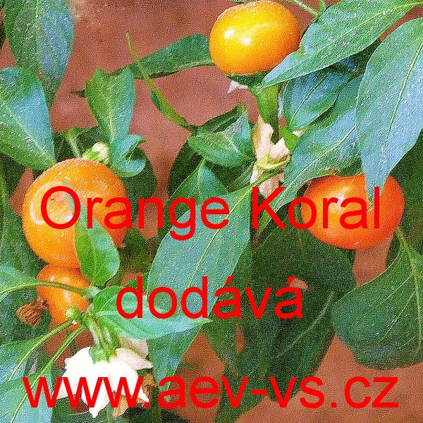 Paprika roční zeleninová (Capsicum annuum L.) Orange Koral je raná/poloraná oranžová silněji ostrá SHU cca 25 000 aromatická kulatá (třešňová) asi 2 až 3 centimetrová zeleninová paprika roční na nakládání i sušení.