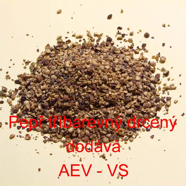 Popis: Pepř tříbarevný drcený, obsahuje: pepř bílý, černý a zelený, v proměnlivých hmotnostních podílech.