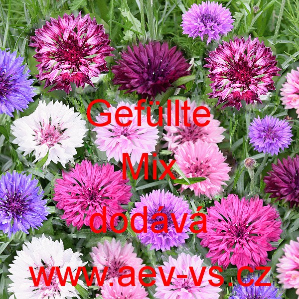 Popis: Chrpa modrá, polní (Centaurea cyanus) Gefüllte Mix je asi 60 až 80 centimetrů vysoká až plnokvětá směs jednoletých květin. Vykvétá většími bílými, růžovými, červenými, modrými a až fialovými zářivě barevnými květy (v odstínech). Použít ji můžeme i do vázy, k řezu. Hodí se na záhon, do velkého truhlíku, květináče a okrasného koryta.
