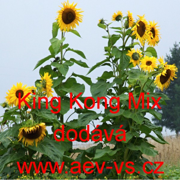 Popis: Slunečnice roční (Helianthus annuus) King Kong Mix je vysoká jednoletá květina. Vykvétá velkými zlatožlutými (v odstínech) květy s velkými tmavými středy. Po seříznutí nasazuje další menší květy.