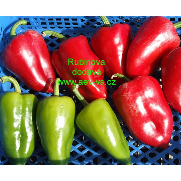Paprika roční zeleninová (Capsicum annuum L.) Rubinova je raná až poloraná asi 150 gramová silnostěnná, síla stěna asi 6 až 8 milimetru, široce kuželovitá tmavě zelená po dozrání tmavě červená zeleninová paprika roční na záhon.