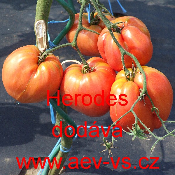 Popis: Rajče tyčkové (Solanum lycopersicum L.) Herodes je polorané pevné červené masité až asi 250 gramové tyčkové rajče, typ býčí srdce do fóliovníku i na záhon. Hodí se i na grilování a rožnění.