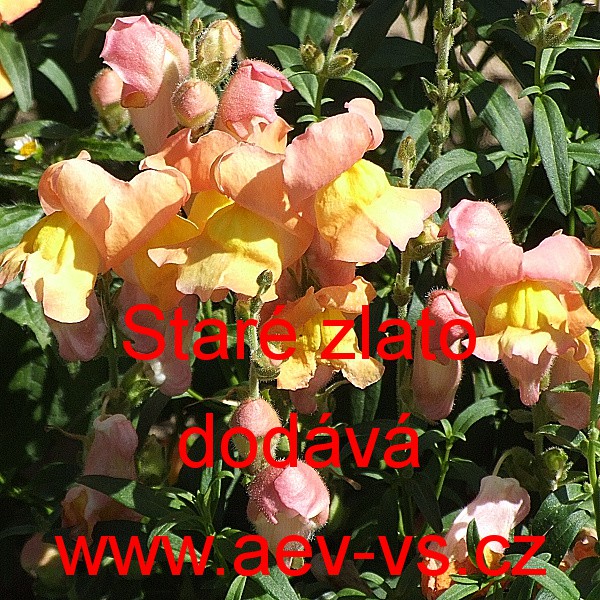 Popis: Hledík větší (Antirrhinum majus maximum) Staré zlato je asi 90 centimetrů vysoká žlutooranžová jednoletá květina.