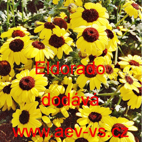 Popis: Kopretina osenní, Zlateň osenní (Chrysanthemum segetum) Eldorado je 50 centimetrů vysoká žlutá (v odstínech) jednoletá květina s hnědým středem.