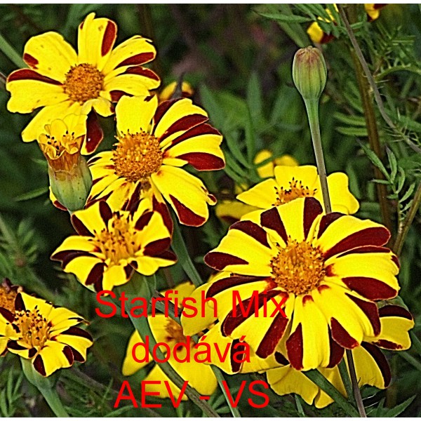 Popis: Aksamitník rozkladitý (Tagetes patula) Starfish Mix je asi 30 centimetrů vysoká červenohnědá (v odstínech) žlutě pruhovaná jednoduše kvetoucí jednoletá květina. Hodí se na záhon, do truhlíku, květináče a okrasného koryta.