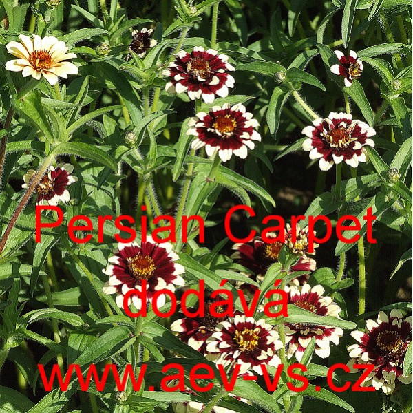 Popis: Ostálka Haageova, cínie (Zinnia Haageana) Persian Carpet je asi 50 centimetrů vysoká směs jednoletých květin. Hodí se na záhon, do truhlíku, květináče a okrasného koryta.