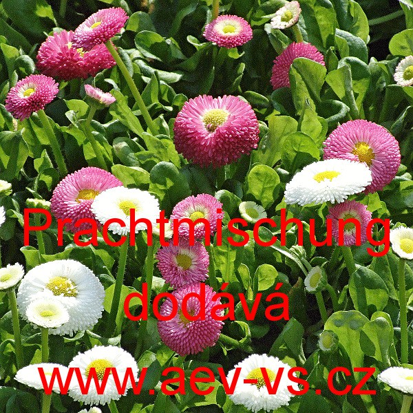 Popis: Sedmikráska obecná (Bellis perennis) Prachtmischung je nízká plnokvětá barevná směs dvouletek. Dvouletky vykvétají od druhého roku růstu. Některé z nich kvetou i několik let. Letní výsevy dvouletek nám umožňují využít záhony i pro jarní pěstování raných zelenin.