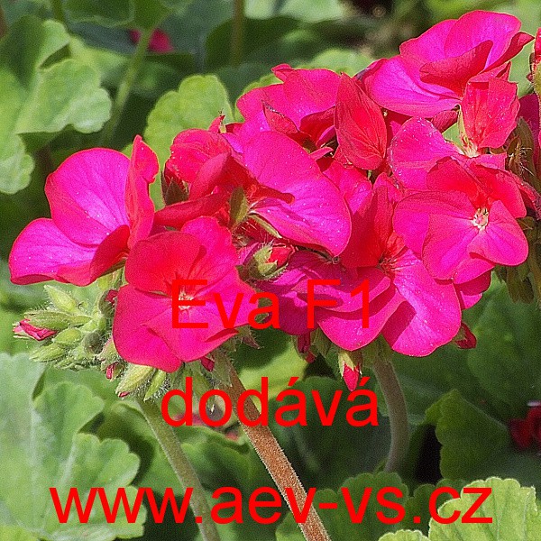 Muškát páskatý (Pelargonium hortorum) Eva F1 je nízká červenofialová jednoletá květina. Obrůstá zelenými listy s tmavší kresbou v listu.