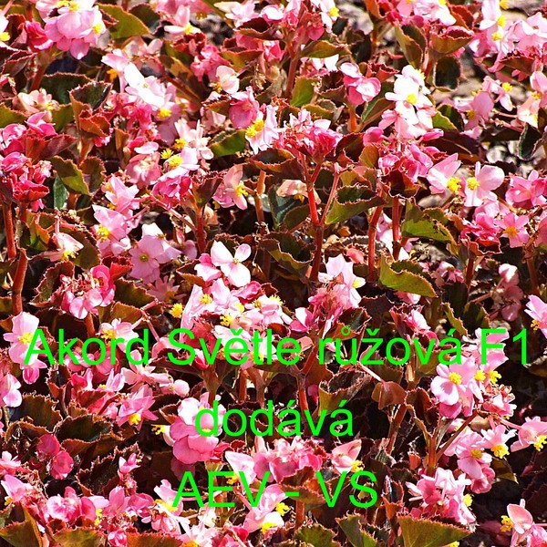 Popis: Kysala stálekvetoucí, ledovka (Begonia semperflorens) Akord F1 Světle růžová je asi 25 centimetrů vysoká hnědolistá jednoletá květina. Hodí se na záhon, do truhlíku, květináče a okrasného koryta.