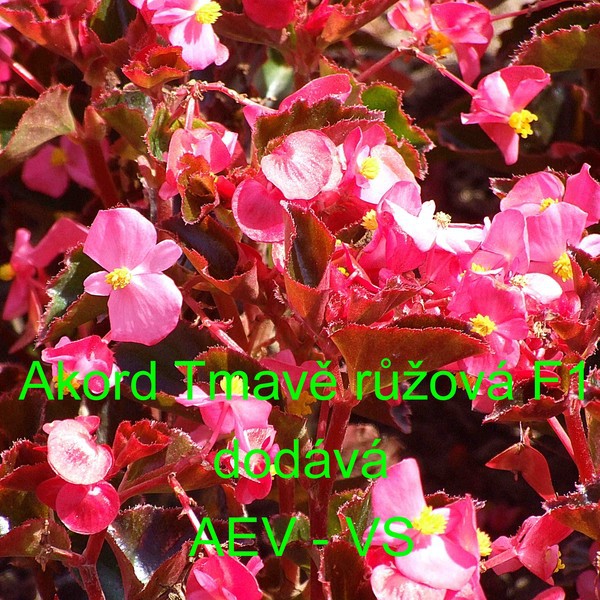 Popis: Kysala stálekvetoucí, ledovka (Begonia semperflorens) Akord F1 Tmavě růžová je asi 25 centimetrů vysoká hnědolistá jednoletá květina. Hodí se na záhon, do truhlíku, květináče a okrasného koryta.