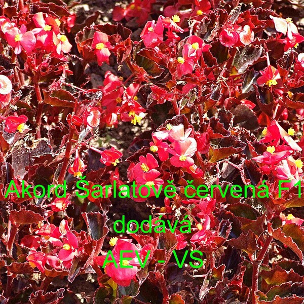 Popis: Kysala stálekvetoucí, ledovka (Begonia semperflorens) Akord F1 Šarlatově červená je asi 25 centimetrů vysoká hnědolistá jednoletá květina. Hodí se na záhon, do truhlíku, květináče a okrasného koryta.