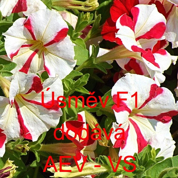 Popis: Petúnie velkokvětá, zkřížená, nízká (Petunia hybrida grandiflora nana) Úsměv F1 je asi 35 centimetrů vysoká dvoubarevná červená/bílá velkokvětá jednoletá květina. V nádobách hlouběji přepadává přes okraje a vytváří nádherné převisy. Hodí se na záhon, do truhlíku, květináče a okrasného koryta. Semena se dodávají ve výběrové kvalitě Professional Seeds.