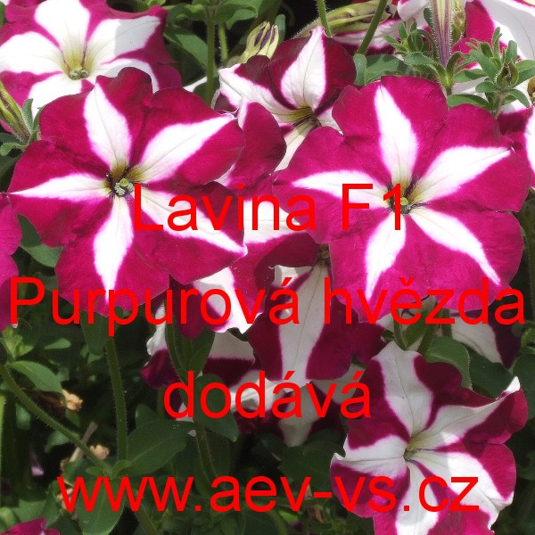 Popis: Petúnie velkokvětá převislá (Petunia hybrida grandiflora pendula) Lavina F1 Purpurová hvězda je asi 35 centimetrů vysoká převislá velkokvětá jednoletá květina. Vytváří až 70 centimetrové převisy. Hodí se na záhon, do truhlíku, květináče a okrasného koryta. Semena se dodávají ve výběrové kvalitě Professional Seeds.