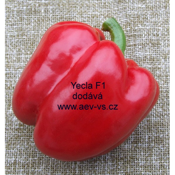 Paprika roční zeleninová (Capsicum annuum L.) Yecla F1 je extra raná extra masitá asi 10x10 centimetrů velká asi 170 až 190 gramů těžká zelená po dozrání sytě červená hybridní zeleninová paprika roční do skleníku, fóliovníku i na prosluněný záhon.